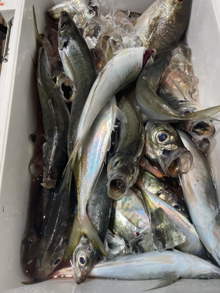 今日も、まだ明るい時間帯からアジがポツポツアタリだし、中盤からあちらこちらでロッドがブチ曲がっている状況でした✨