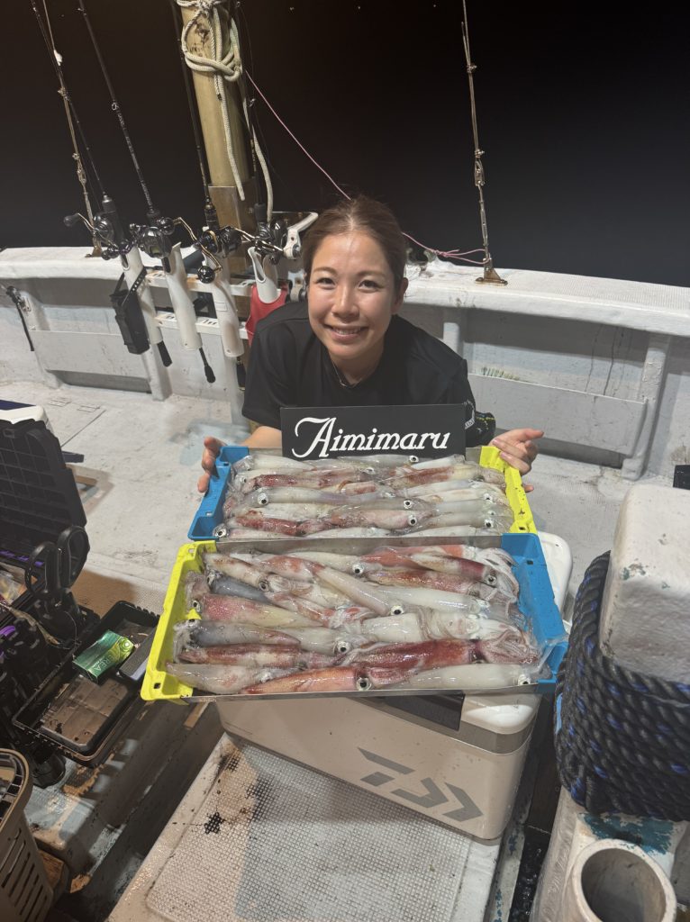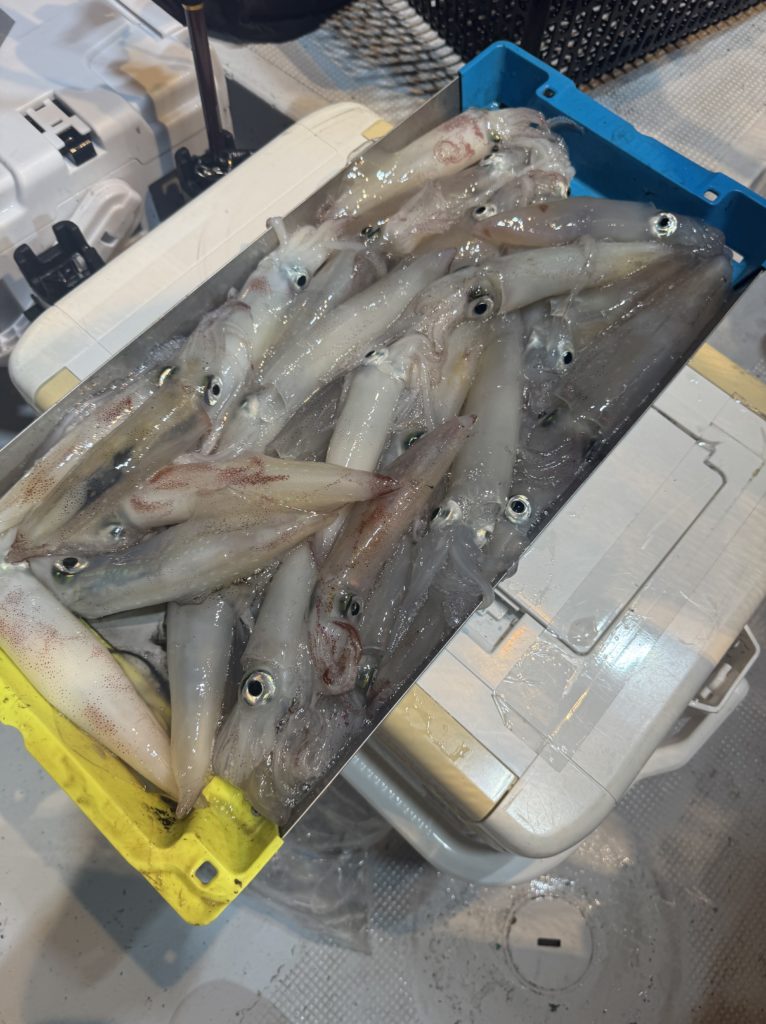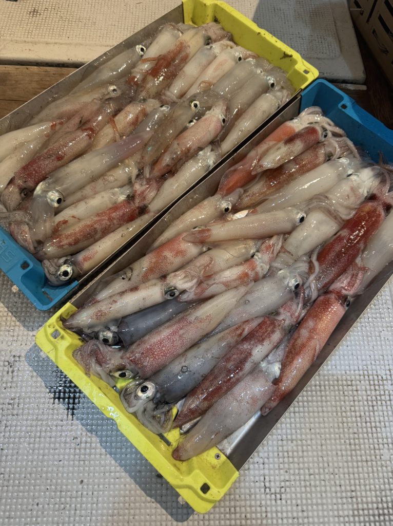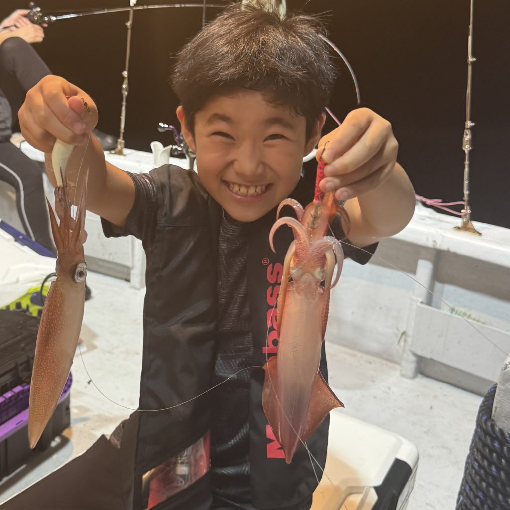 集魚灯を点けてしばらくすると、浅棚で勢いよく連発ヒット🦑🦑 棚浅く前半の地合いでワイワイと良いスタートがきれました😁