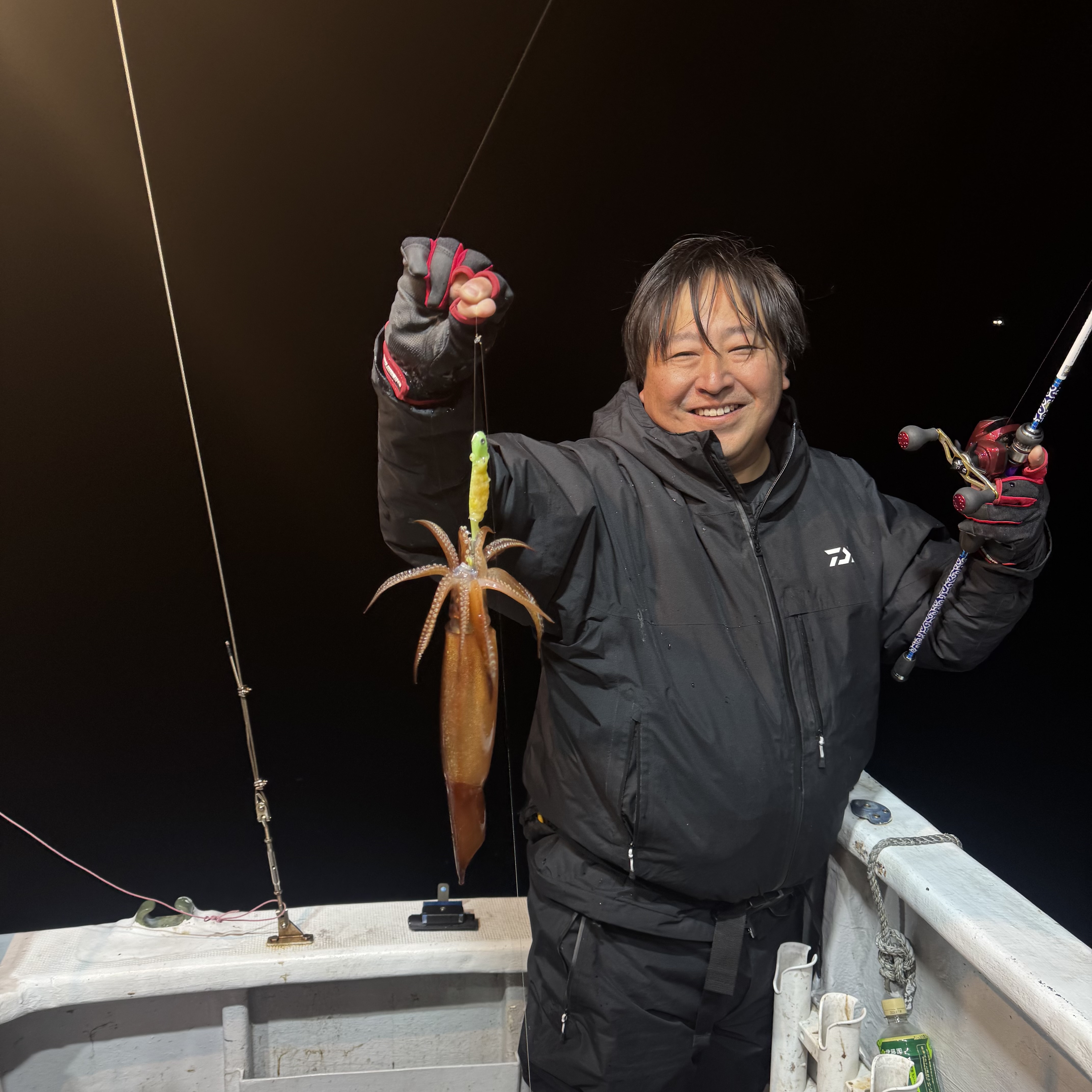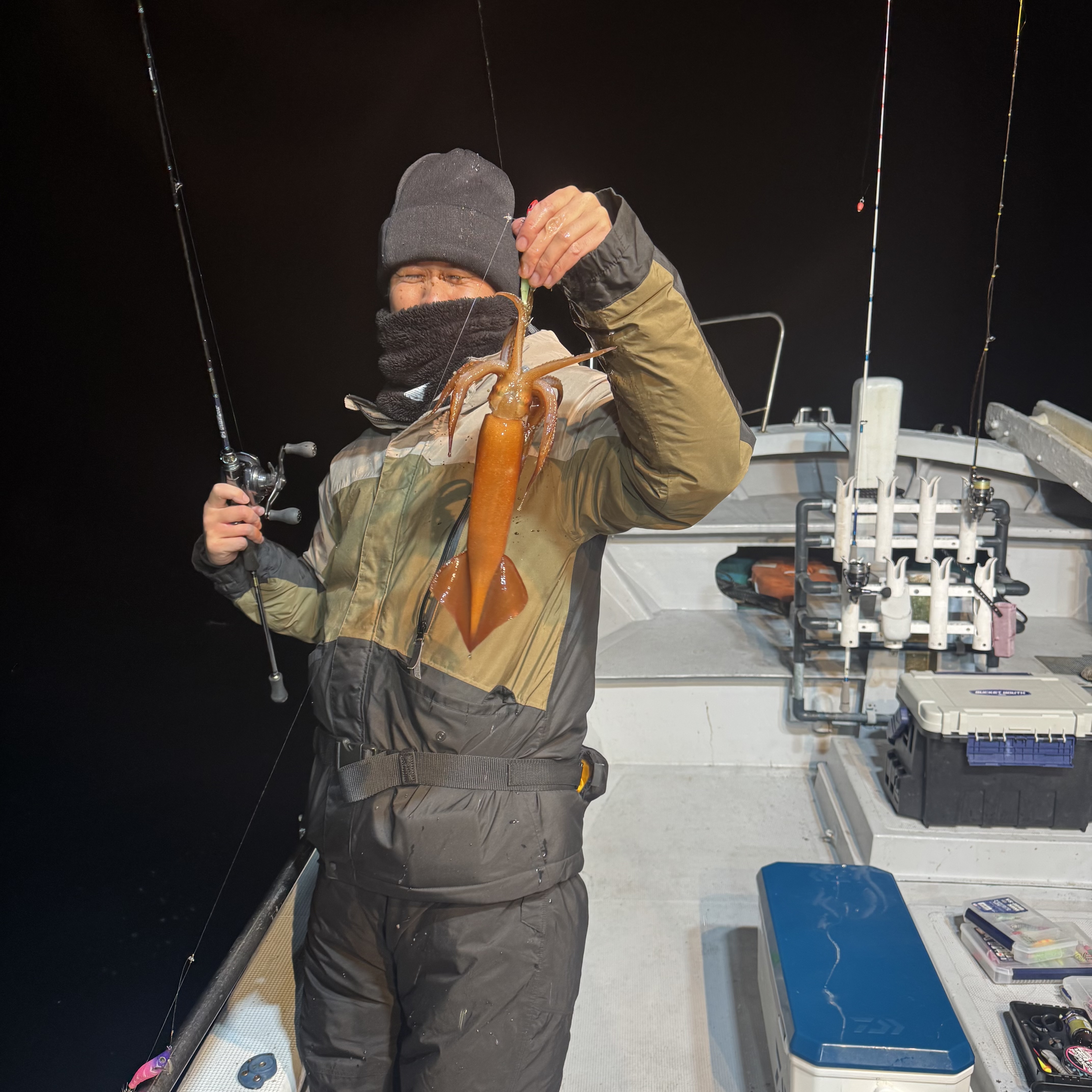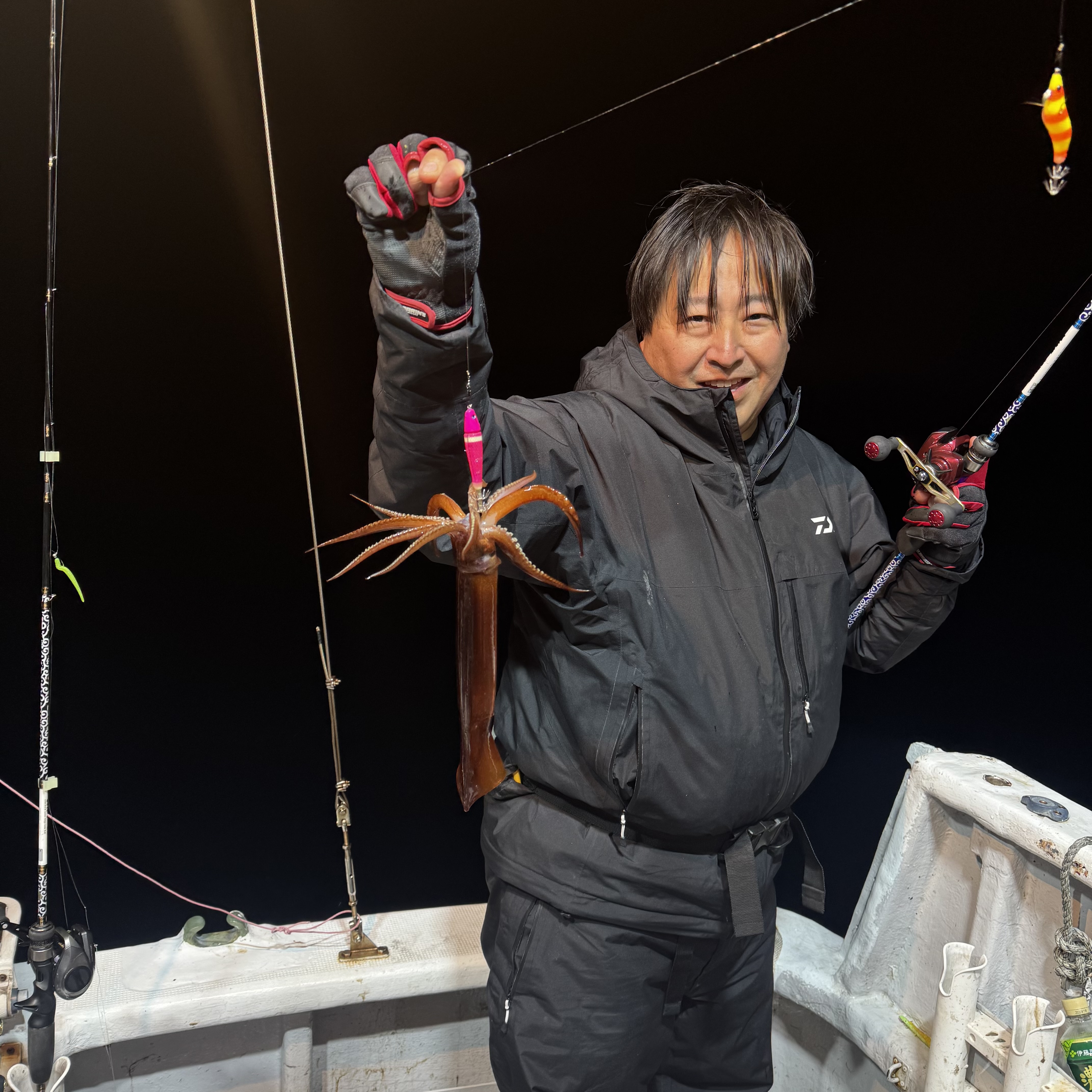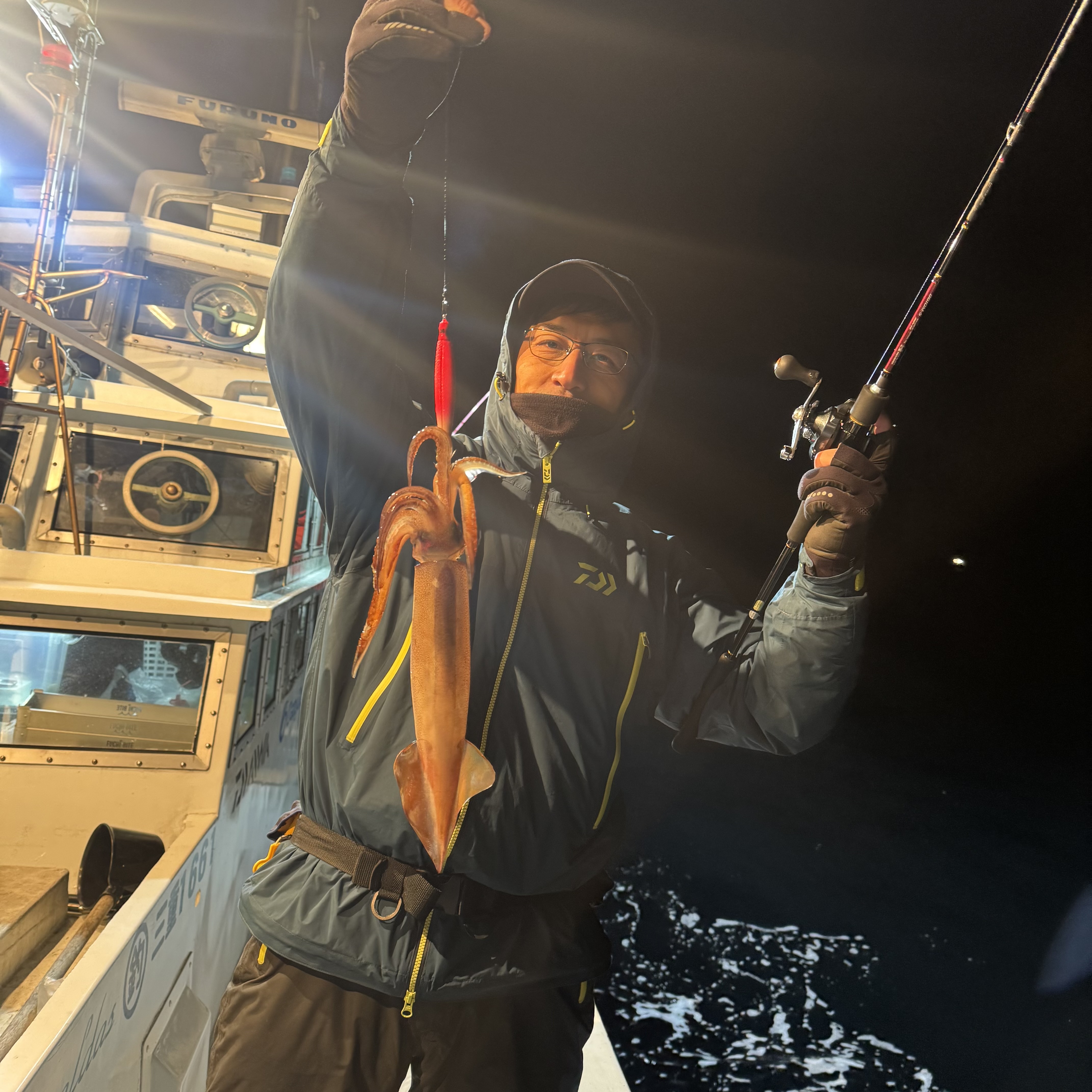 集魚灯を点けてしばらくするとヤリイカがヒット🦑今シーズンは例年より水温が低くく、ヤリイカが来そうな雰囲気🤭