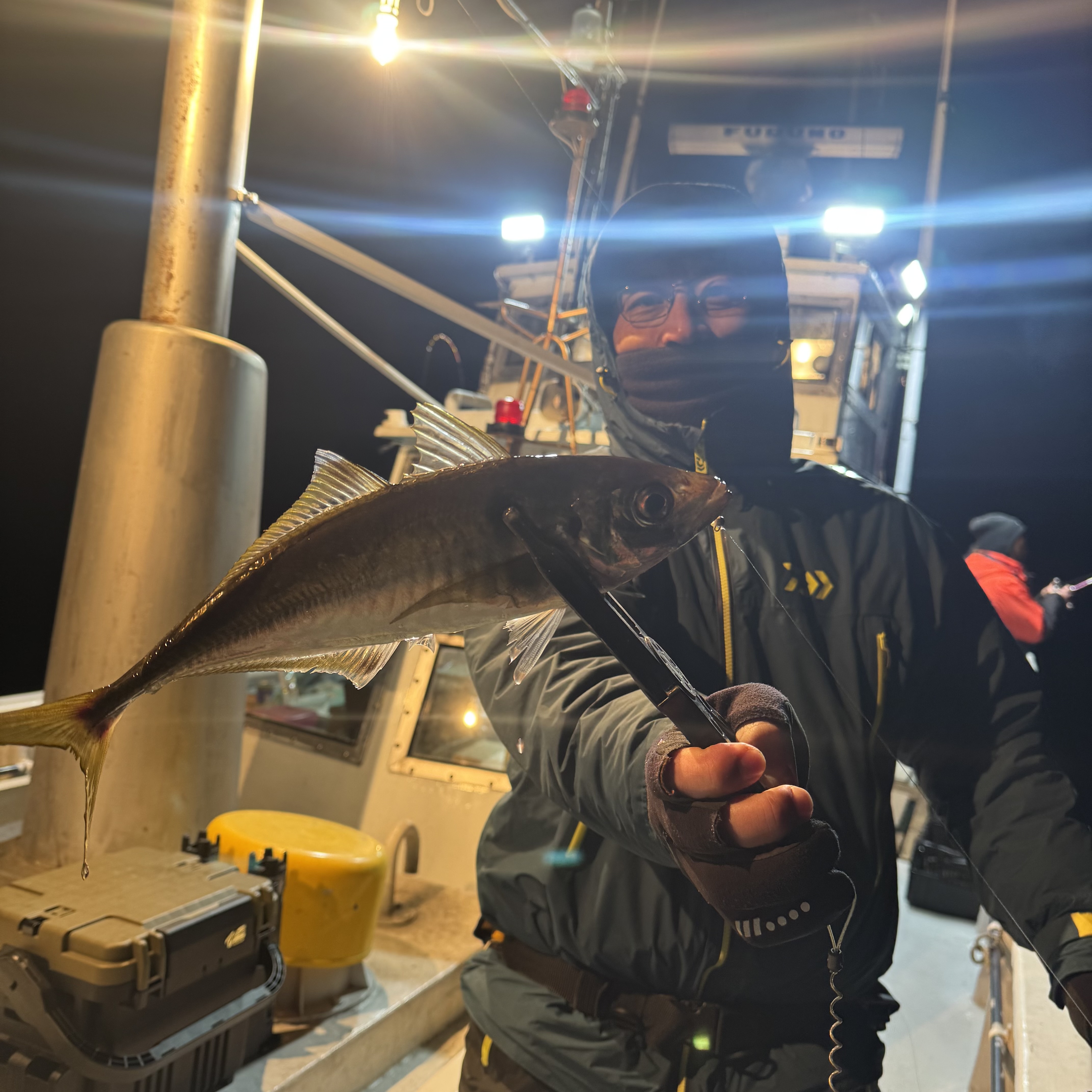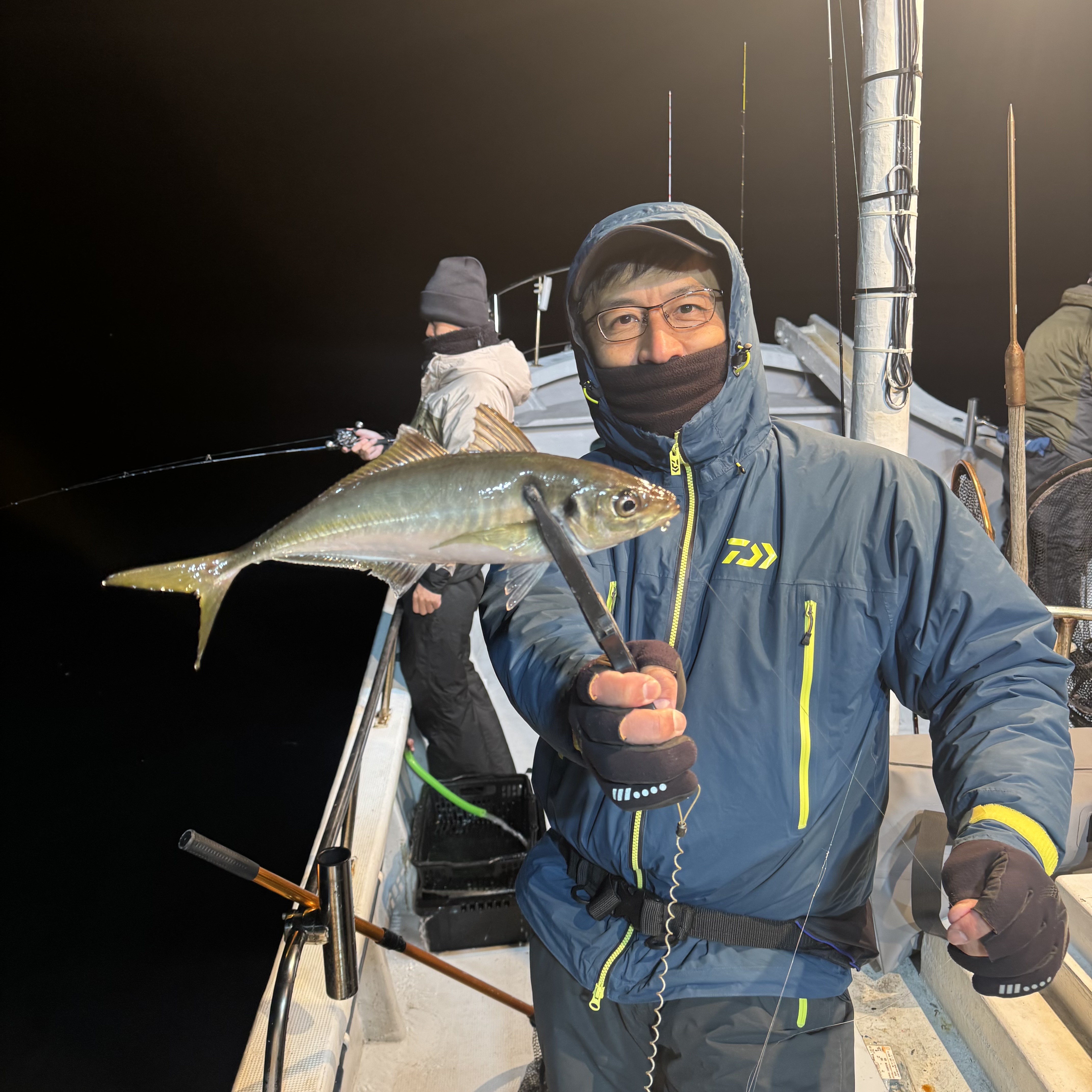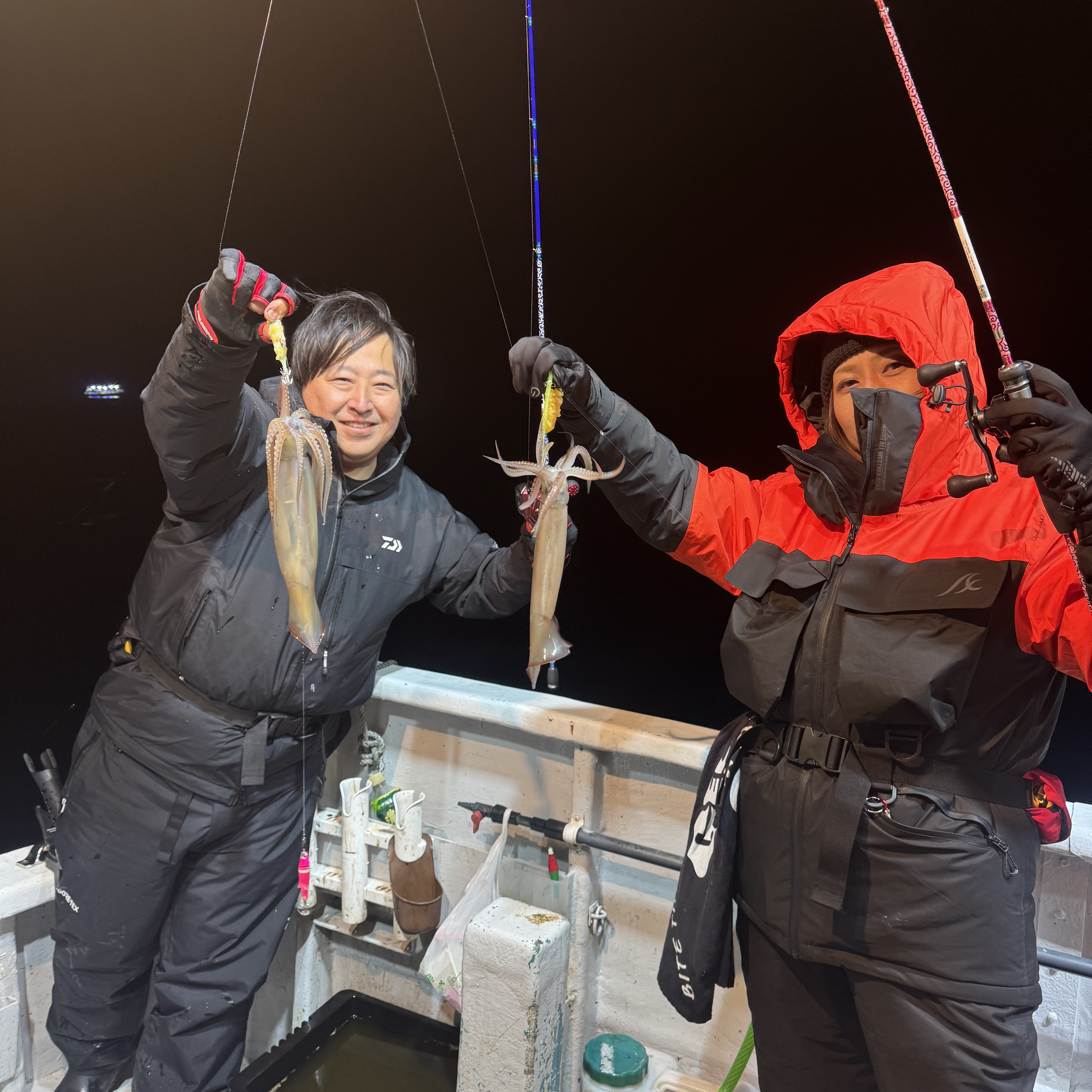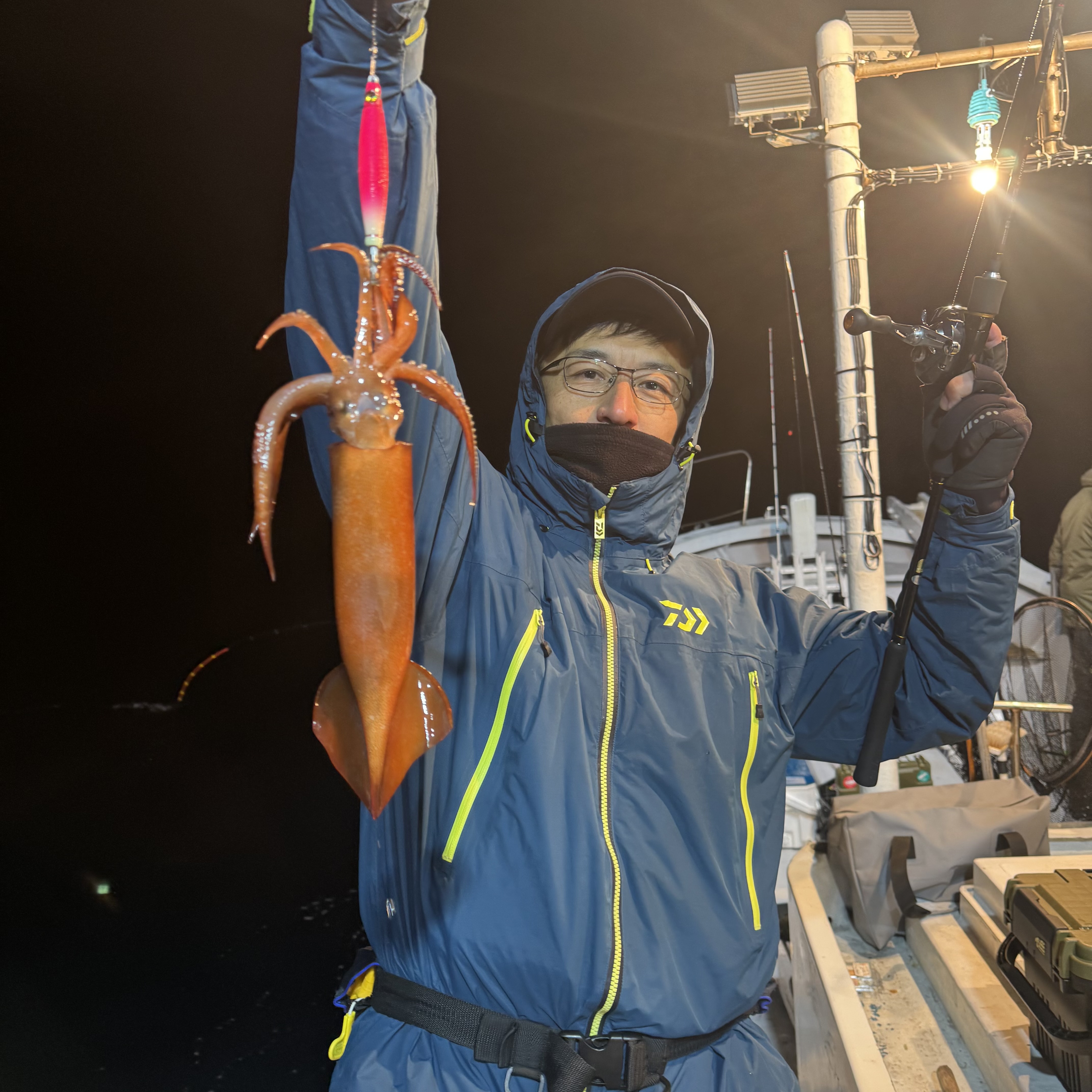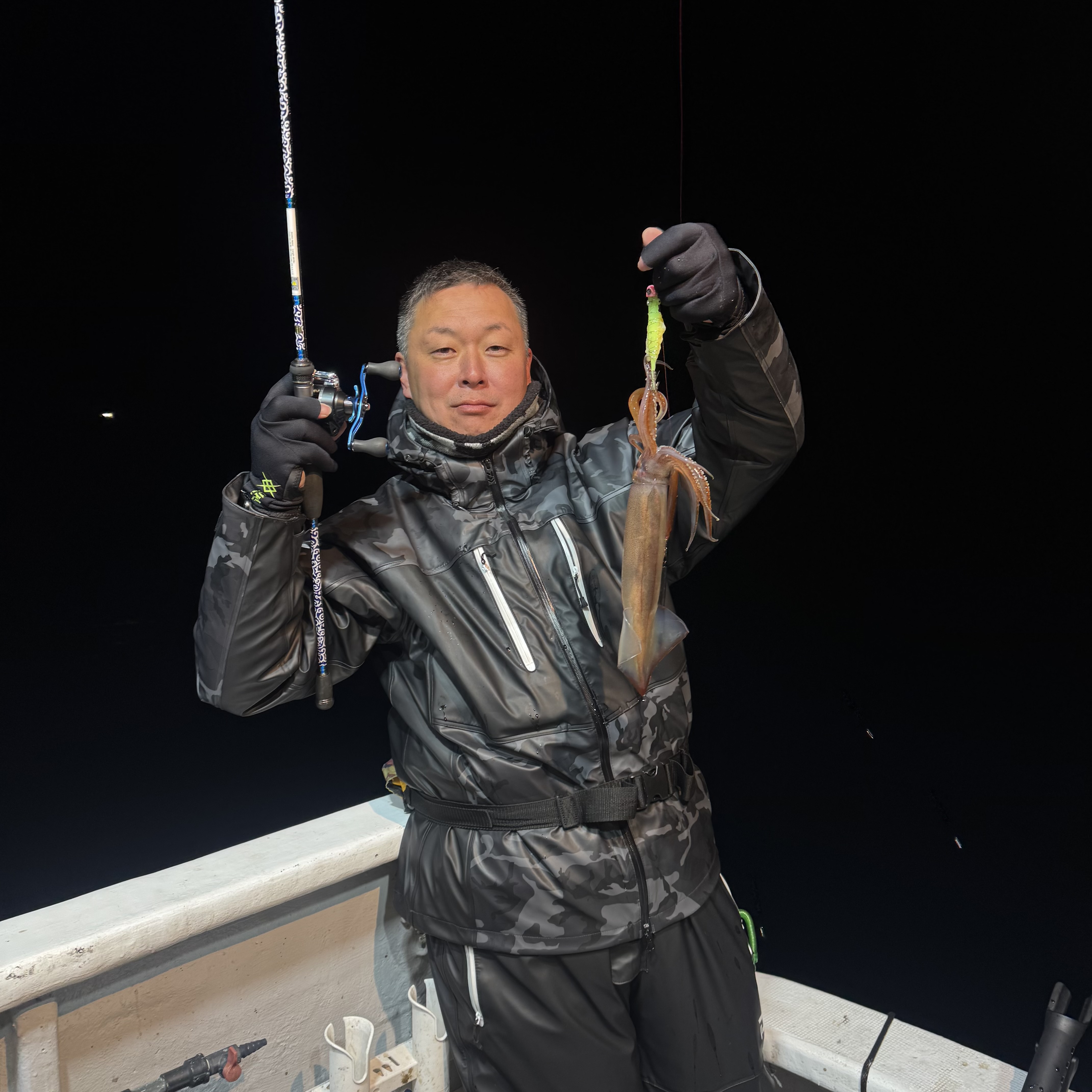 集魚灯を点けてしばらくするとヤリイカがヒット🦑今シーズンは例年より水温が低くく、ヤリイカが来そうな雰囲気🤭
